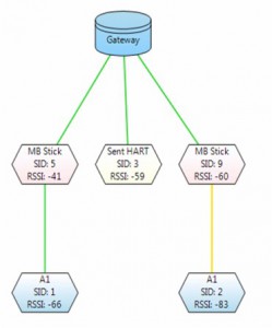 Network Mapping – provides a simple visual graphical representation of a user’s SignalFire Mesh Network including which nodes are reporting through other nodes and the signal strengths of each link (the SFRSS consist of a Gateway and nodes that interface with remote assets and extract data from or send control data to those devices through other nodes and/or the gateway.)